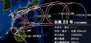 現在、台風23号が日本に迫ってきていて、週末西日本から東日本を通りそうな予想進路になっています。